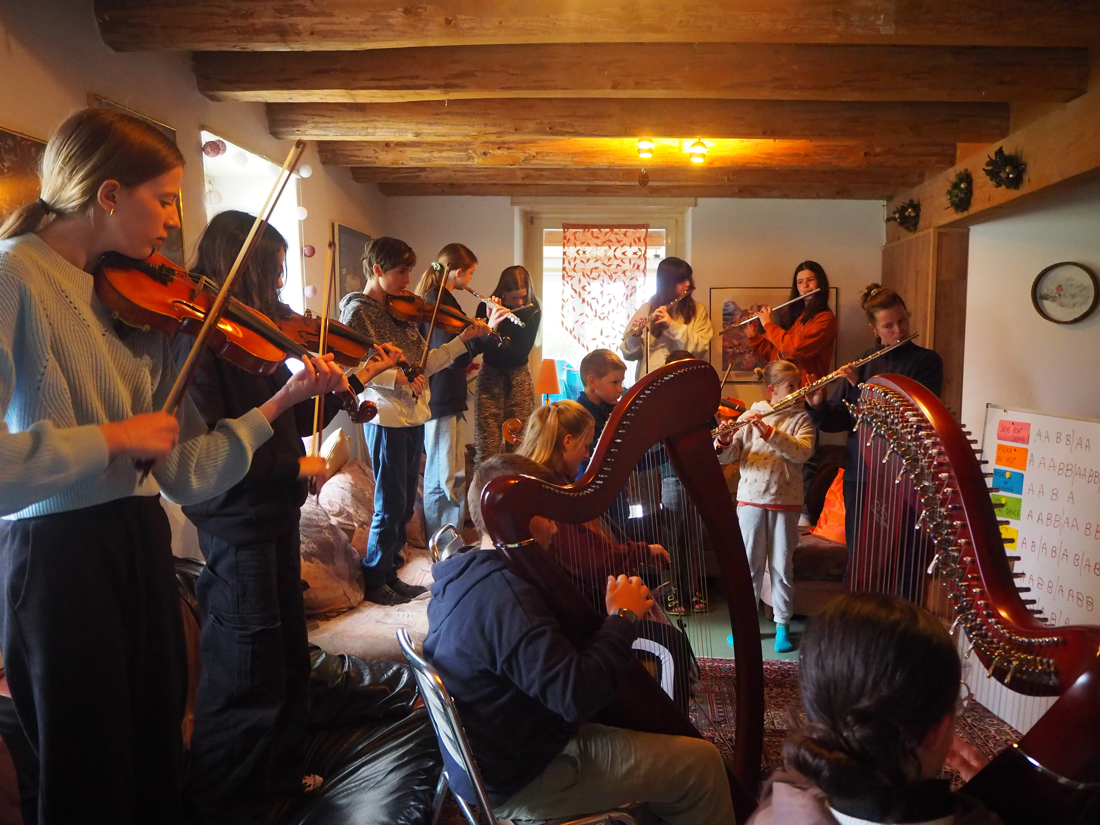 A Polkanapé, on apprend des polkas (et des gigues, des reels, des hornpipes, des valses,… bref, de la musique irlandaise !) sans partition, puis on joue ensemble le soir en session dans les canapés. A la fin de la semaine, on rassemble le tout dans un joyeux concert final qui nous permet de partager nos découvertes et nos apprentissages avec le public.