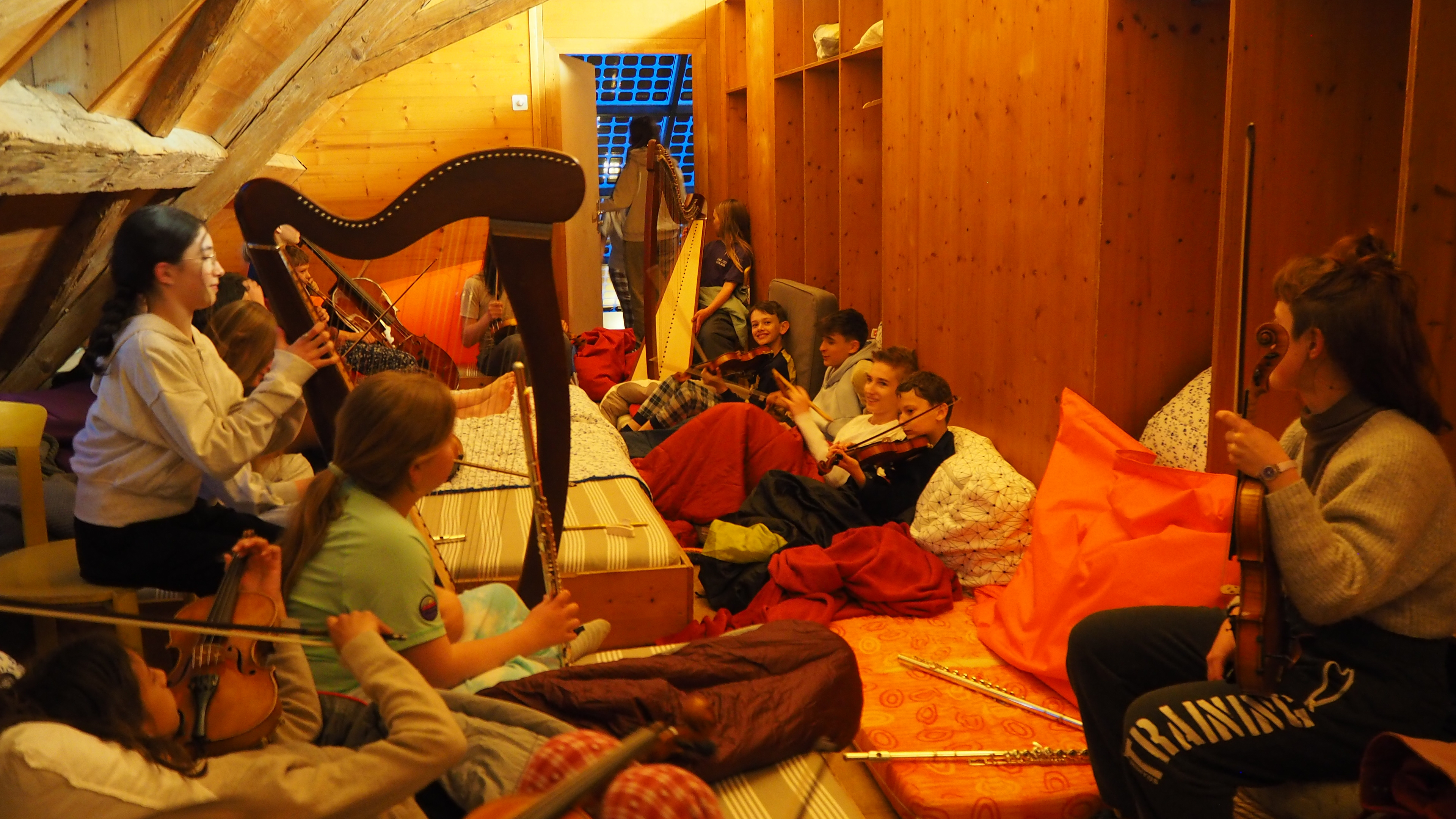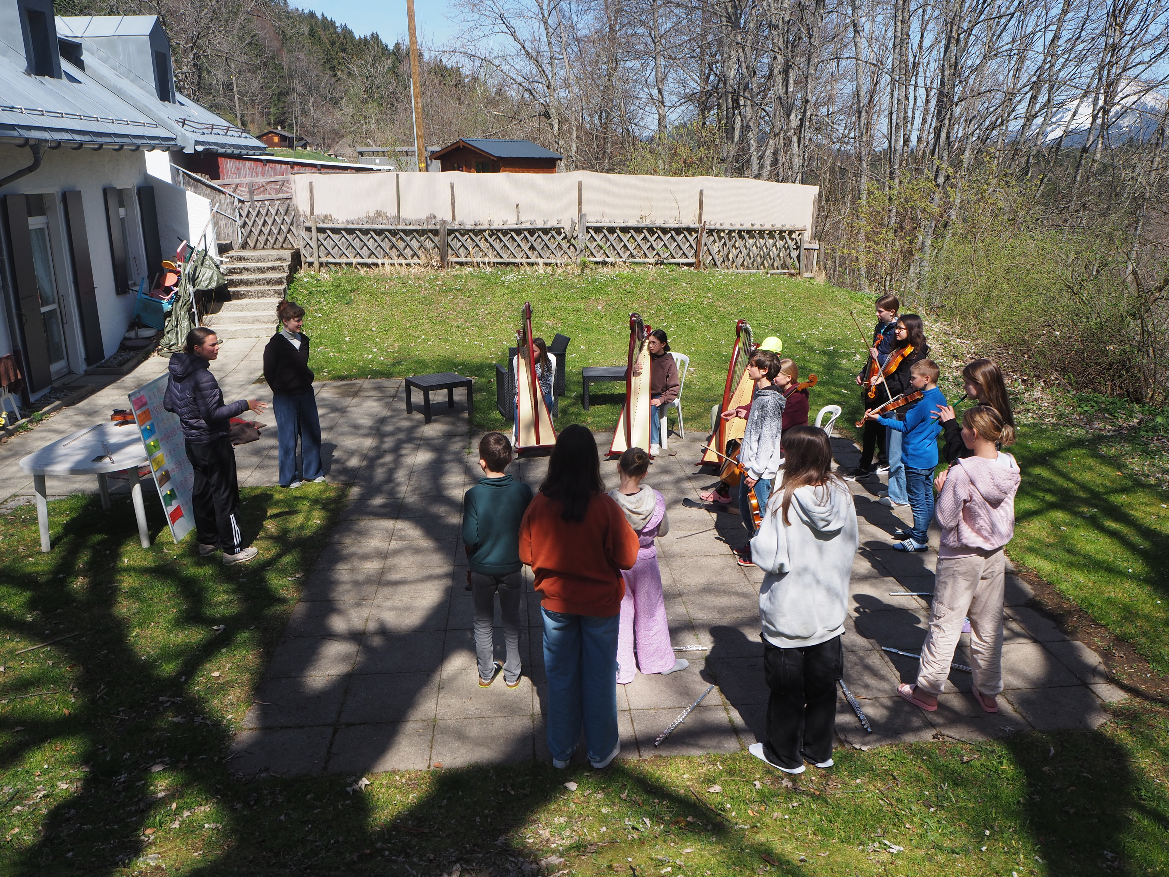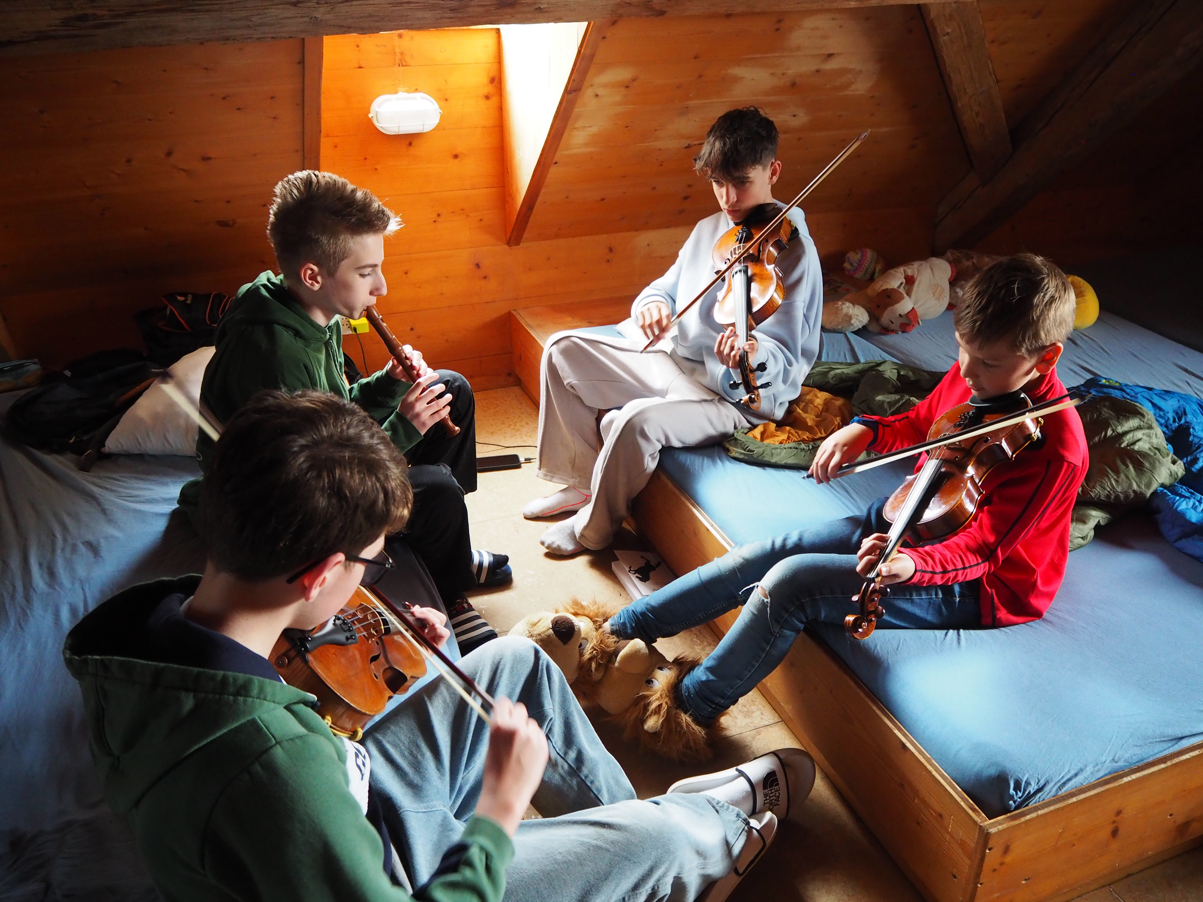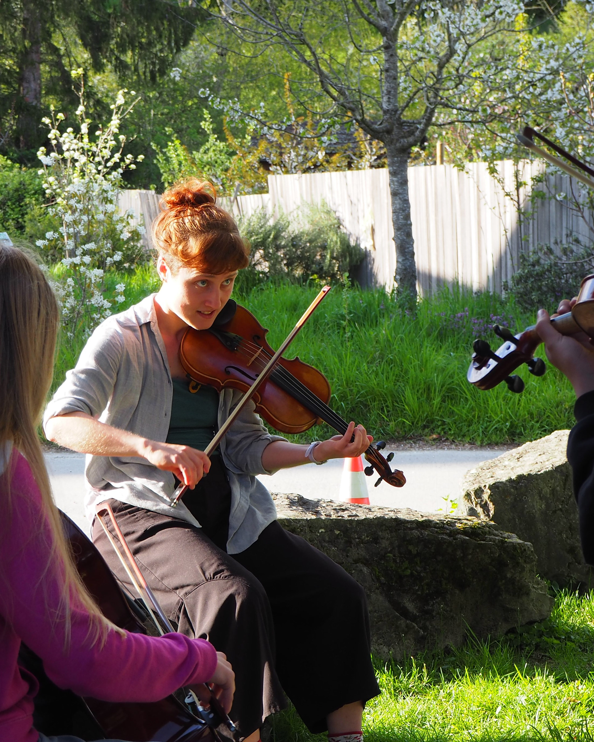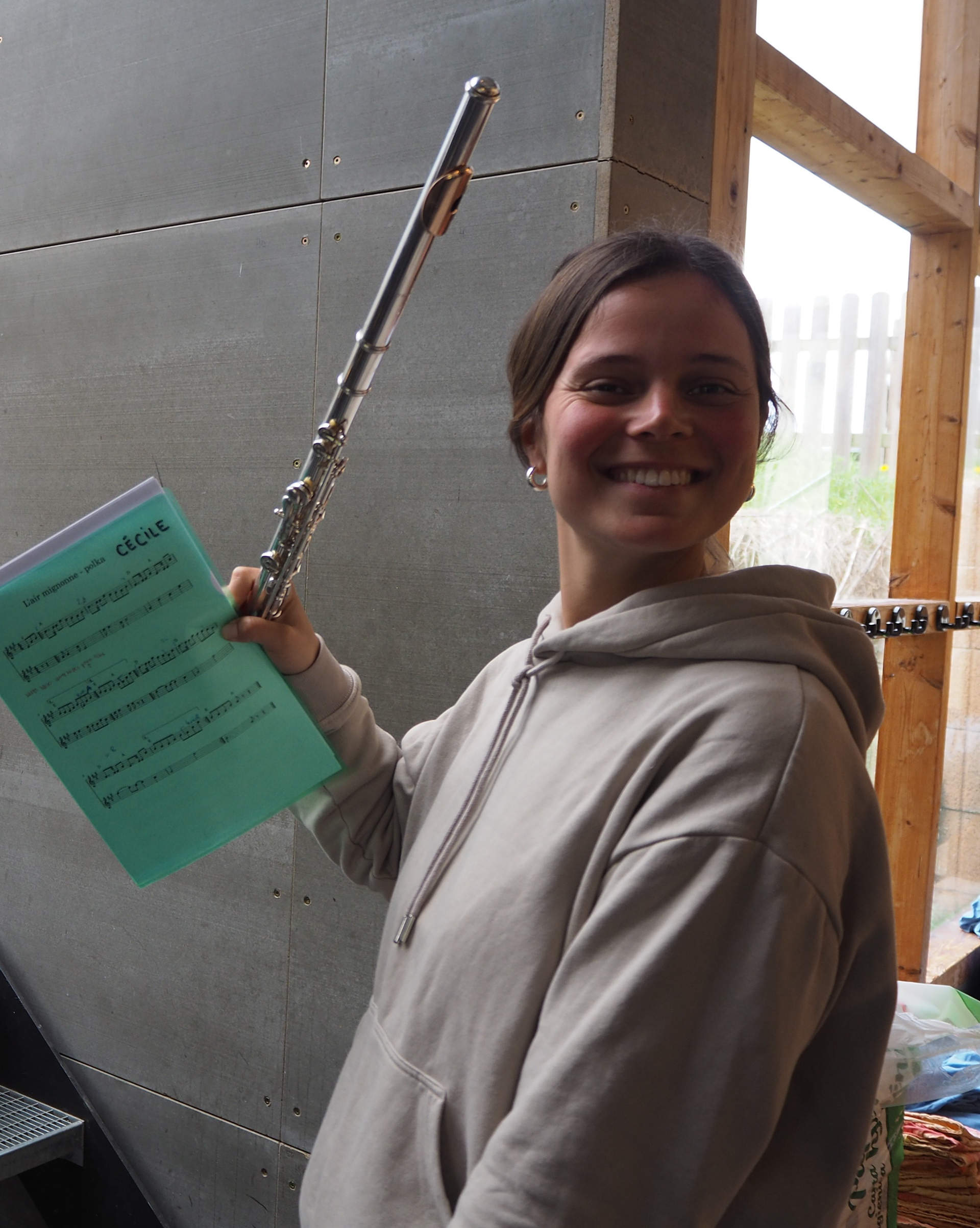Elle bouge son archet plus vite que la musique et il faut s’accrocher pour la suivre dans des reels endiablés ! Avec son violon, mais aussi occasionnellement un violoncelle ou un piano trouvés par-ci par-là, elle complète le duo de direction musicale avec Cécile. Ensemble, elles arrangent également en amont toute la musique du camp pour que chacun.e y trouve son compte !